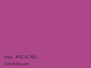 Hex #ad478a Color is a normal magenta color and the nearest color is Mystic Maroon #ad4379. Hex code #ad478a and RGB value is rgb(173,71,138). In RGB color space, this color is composed of 68% red, 28% green, 54% blue, In CMYK color space, this color is composed of 0% cyan, 59% magenta, 20% yellow , 32% black , In HSL color space, this color has a hue angle of 321° , 42% saturation and 48% lightness.