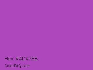 Hex #ad47bb Color is a normal magenta color and the nearest color is Purple Plum #9c51b6. Hex code #ad47bb and RGB value is rgb(173,71,187). In RGB color space, this color is composed of 68% red, 28% green, 73% blue, In CMYK color space, this color is composed of 7% cyan, 62% magenta, 0% yellow , 27% black , In HSL color space, this color has a hue angle of 293° , 46% saturation and 51% lightness.