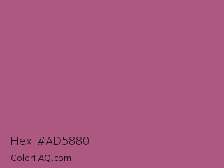Hex #ad5880 Color is a normal rose color and the nearest color is Tapestry #b05e81. Hex code #ad5880 and RGB value is rgb(173,88,128). In RGB color space, this color is composed of 68% red, 35% green, 50% blue, In CMYK color space, this color is composed of 0% cyan, 49% magenta, 26% yellow , 32% black , In HSL color space, this color has a hue angle of 332° , 34% saturation and 51% lightness.