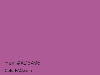 Hex #ad5a96 Color is a normal magenta color and the nearest color is Pearly Purple #b768a2. Hex code #ad5a96 and RGB value is rgb(173,90,150). In RGB color space, this color is composed of 68% red, 35% green, 59% blue, In CMYK color space, this color is composed of 0% cyan, 48% magenta, 13% yellow , 32% black , In HSL color space, this color has a hue angle of 317° , 34% saturation and 52% lightness.