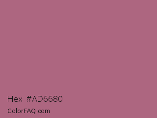 Hex #ad6680 Color is a normal rose color and the nearest color is Tapestry #b05e81. Hex code #ad6680 and RGB value is rgb(173,102,128). In RGB color space, this color is composed of 68% red, 40% green, 50% blue, In CMYK color space, this color is composed of 0% cyan, 41% magenta, 26% yellow , 32% black , In HSL color space, this color has a hue angle of 338° , 30% saturation and 54% lightness.