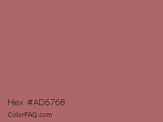 Hex #ad6768 Color is a normal red color and the nearest color is Coral Tree #a86b6b. Hex code #ad6768 and RGB value is rgb(173,103,104). In RGB color space, this color is composed of 68% red, 40% green, 41% blue, In CMYK color space, this color is composed of 0% cyan, 40% magenta, 40% yellow , 32% black , In HSL color space, this color has a hue angle of 359° , 30% saturation and 54% lightness.