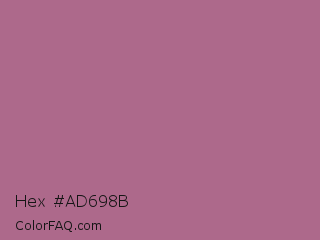 Hex #ad698b Color is a normal rose color and the nearest color is Tapestry #b05e81. Hex code #ad698b and RGB value is rgb(173,105,139). In RGB color space, this color is composed of 68% red, 41% green, 55% blue, In CMYK color space, this color is composed of 0% cyan, 39% magenta, 20% yellow , 32% black , In HSL color space, this color has a hue angle of 330° , 29% saturation and 55% lightness.