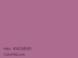 Hex #ad6b90 Color is a normal magenta color and the nearest color is Turkish Rose #b57281. Hex code #ad6b90 and RGB value is rgb(173,107,144). In RGB color space, this color is composed of 68% red, 42% green, 56% blue, In CMYK color space, this color is composed of 0% cyan, 38% magenta, 17% yellow , 32% black , In HSL color space, this color has a hue angle of 326° , 29% saturation and 55% lightness.