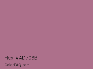 Hex #ad708b Color is a normal rose color and the nearest color is Turkish Rose #b57281. Hex code #ad708b and RGB value is rgb(173,112,139). In RGB color space, this color is composed of 68% red, 44% green, 55% blue, In CMYK color space, this color is composed of 0% cyan, 35% magenta, 20% yellow , 32% black , In HSL color space, this color has a hue angle of 333° , 27% saturation and 56% lightness.