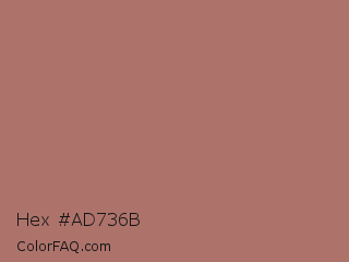 Hex #ad736b Color is a normal red color and the nearest color is Copper Penny #ad6f69. Hex code #ad736b and RGB value is rgb(173,115,107). In RGB color space, this color is composed of 68% red, 45% green, 42% blue, In CMYK color space, this color is composed of 0% cyan, 34% magenta, 38% yellow , 32% black , In HSL color space, this color has a hue angle of 7° , 29% saturation and 55% lightness.