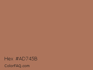 Hex #ad745b Color is a normal orange color and the nearest color is French Beige #a67b5b. Hex code #ad745b and RGB value is rgb(173,116,91). In RGB color space, this color is composed of 68% red, 45% green, 36% blue, In CMYK color space, this color is composed of 0% cyan, 33% magenta, 47% yellow , 32% black , In HSL color space, this color has a hue angle of 18° , 33% saturation and 52% lightness.