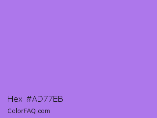 Hex #ad77eb Color is a light violet color and the nearest color is Lavender #b57edc. Hex code #ad77eb and RGB value is rgb(173,119,235). In RGB color space, this color is composed of 68% red, 47% green, 92% blue, In CMYK color space, this color is composed of 26% cyan, 49% magenta, 0% yellow , 8% black , In HSL color space, this color has a hue angle of 268° , 74% saturation and 69% lightness.