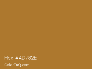 Hex #ad782e Color is a normal orange color and the nearest color is Copper #b87333. Hex code #ad782e and RGB value is rgb(173,120,46). In RGB color space, this color is composed of 68% red, 47% green, 18% blue, In CMYK color space, this color is composed of 0% cyan, 31% magenta, 73% yellow , 32% black , In HSL color space, this color has a hue angle of 35° , 58% saturation and 43% lightness.