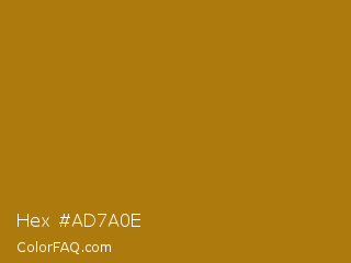 Hex #ad7a0e Color is a normal orange color and the nearest color is Hot Toddy #b38007. Hex code #ad7a0e and RGB value is rgb(173,122,14). In RGB color space, this color is composed of 68% red, 48% green, 5% blue, In CMYK color space, this color is composed of 0% cyan, 29% magenta, 92% yellow , 32% black , In HSL color space, this color has a hue angle of 41° , 85% saturation and 37% lightness.