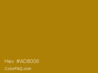 Hex #ad8006 Color is a normal orange color and the nearest color is Hot Toddy #b38007. Hex code #ad8006 and RGB value is rgb(173,128,6). In RGB color space, this color is composed of 68% red, 50% green, 2% blue, In CMYK color space, this color is composed of 0% cyan, 26% magenta, 97% yellow , 32% black , In HSL color space, this color has a hue angle of 44° , 93% saturation and 35% lightness.