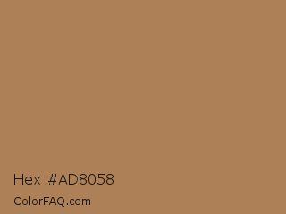 Hex #ad8058 Color is a normal orange color and the nearest color is French Beige #a67b5b. Hex code #ad8058 and RGB value is rgb(173,128,88). In RGB color space, this color is composed of 68% red, 50% green, 35% blue, In CMYK color space, this color is composed of 0% cyan, 26% magenta, 49% yellow , 32% black , In HSL color space, this color has a hue angle of 28° , 34% saturation and 51% lightness.