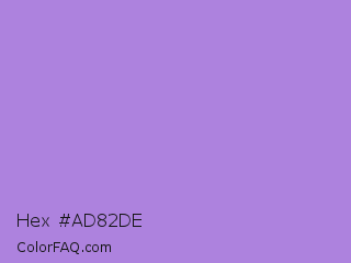 Hex #ad82de Color is a light violet color and the nearest color is Lavender #b57edc. Hex code #ad82de and RGB value is rgb(173,130,222). In RGB color space, this color is composed of 68% red, 51% green, 87% blue, In CMYK color space, this color is composed of 22% cyan, 41% magenta, 0% yellow , 13% black , In HSL color space, this color has a hue angle of 268° , 58% saturation and 69% lightness.
