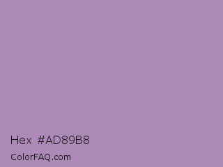 Hex #ad89b8 Color is a light purple color and the nearest color is African Violet #b284be. Hex code #ad89b8 and RGB value is rgb(173,137,184). In RGB color space, this color is composed of 68% red, 54% green, 72% blue, In CMYK color space, this color is composed of 6% cyan, 26% magenta, 0% yellow , 28% black , In HSL color space, this color has a hue angle of 286° , 25% saturation and 63% lightness.