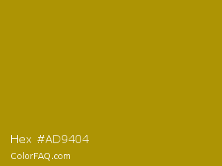 Hex #ad9404 Color is a normal yellow color and the nearest color is Dark Goldenrod #b8860b. Hex code #ad9404 and RGB value is rgb(173,148,4). In RGB color space, this color is composed of 68% red, 58% green, 2% blue, In CMYK color space, this color is composed of 0% cyan, 14% magenta, 98% yellow , 32% black , In HSL color space, this color has a hue angle of 51° , 95% saturation and 35% lightness.