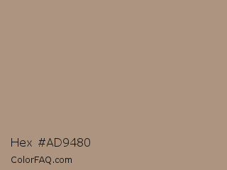 Hex #ad9480 Color is a normal orange color and the nearest color is Sandrift #ab917a. Hex code #ad9480 and RGB value is rgb(173,148,128). In RGB color space, this color is composed of 68% red, 58% green, 50% blue, In CMYK color space, this color is composed of 0% cyan, 14% magenta, 26% yellow , 32% black , In HSL color space, this color has a hue angle of 27° , 22% saturation and 59% lightness.