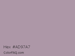 Hex #ad97a7 Color is a light magenta color and the nearest color is Lilac Luster #ae98aa. Hex code #ad97a7 and RGB value is rgb(173,151,167). In RGB color space, this color is composed of 68% red, 59% green, 65% blue, In CMYK color space, this color is composed of 0% cyan, 13% magenta, 3% yellow , 32% black , In HSL color space, this color has a hue angle of 316° , 12% saturation and 64% lightness.