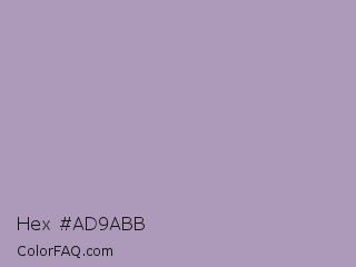 Hex #ad9abb Color is a light purple color and the nearest color is Pastel Purple #b39eb5. Hex code #ad9abb and RGB value is rgb(173,154,187). In RGB color space, this color is composed of 68% red, 60% green, 73% blue, In CMYK color space, this color is composed of 7% cyan, 18% magenta, 0% yellow , 27% black , In HSL color space, this color has a hue angle of 275° , 20% saturation and 67% lightness.