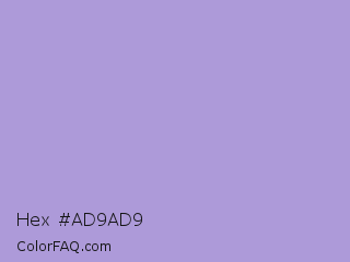 Hex #ad9ad9 Color is a light indigo color and the nearest color is Light Pastel Purple #b19cd9. Hex code #ad9ad9 and RGB value is rgb(173,154,217). In RGB color space, this color is composed of 68% red, 60% green, 85% blue, In CMYK color space, this color is composed of 20% cyan, 29% magenta, 0% yellow , 15% black , In HSL color space, this color has a hue angle of 258° , 45% saturation and 73% lightness.