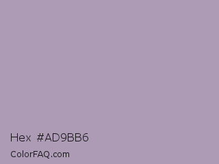 Hex #ad9bb6 Color is a light purple color and the nearest color is Pastel Purple #b39eb5. Hex code #ad9bb6 and RGB value is rgb(173,155,182). In RGB color space, this color is composed of 68% red, 61% green, 71% blue, In CMYK color space, this color is composed of 5% cyan, 15% magenta, 0% yellow , 29% black , In HSL color space, this color has a hue angle of 280° , 16% saturation and 66% lightness.