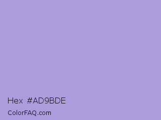 Hex #ad9bde Color is a light indigo color and the nearest color is Light Pastel Purple #b19cd9. Hex code #ad9bde and RGB value is rgb(173,155,222). In RGB color space, this color is composed of 68% red, 61% green, 87% blue, In CMYK color space, this color is composed of 22% cyan, 30% magenta, 0% yellow , 13% black , In HSL color space, this color has a hue angle of 256° , 50% saturation and 74% lightness.