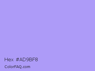 Hex #ad9bf8 Color is a light indigo color and the nearest color is Biloba Flower #b2a1ea. Hex code #ad9bf8 and RGB value is rgb(173,155,248). In RGB color space, this color is composed of 68% red, 61% green, 97% blue, In CMYK color space, this color is composed of 30% cyan, 38% magenta, 0% yellow , 3% black , In HSL color space, this color has a hue angle of 252° , 87% saturation and 79% lightness.