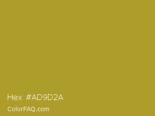 Hex #ad9d2a Color is a normal yellow color and the nearest color is Lemon Ginger #ac9e22. Hex code #ad9d2a and RGB value is rgb(173,157,42). In RGB color space, this color is composed of 68% red, 62% green, 16% blue, In CMYK color space, this color is composed of 0% cyan, 9% magenta, 76% yellow , 32% black , In HSL color space, this color has a hue angle of 53° , 61% saturation and 42% lightness.