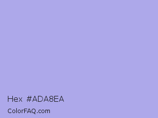 Hex #ada8ea Color is a light indigo color and the nearest color is Maximum Blue Purple #acace6. Hex code #ada8ea and RGB value is rgb(173,168,234). In RGB color space, this color is composed of 68% red, 66% green, 92% blue, In CMYK color space, this color is composed of 26% cyan, 28% magenta, 0% yellow , 8% black , In HSL color space, this color has a hue angle of 245° , 61% saturation and 79% lightness.
