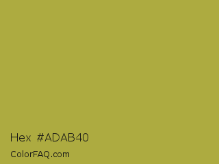 Hex #adab40 Color is a normal yellow color and the nearest color is Brass #b5a642. Hex code #adab40 and RGB value is rgb(173,171,64). In RGB color space, this color is composed of 68% red, 67% green, 25% blue, In CMYK color space, this color is composed of 0% cyan, 1% magenta, 63% yellow , 32% black , In HSL color space, this color has a hue angle of 59° , 46% saturation and 46% lightness.
