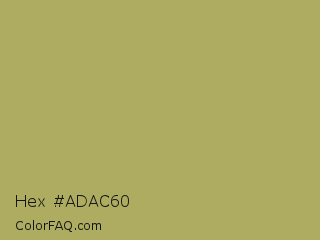 Hex #adac60 Color is a normal yellow color and the nearest color is Olive Green #b5b35c. Hex code #adac60 and RGB value is rgb(173,172,96). In RGB color space, this color is composed of 68% red, 67% green, 38% blue, In CMYK color space, this color is composed of 0% cyan, 1% magenta, 45% yellow , 32% black , In HSL color space, this color has a hue angle of 59° , 32% saturation and 53% lightness.