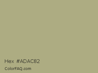 Hex #adac82 Color is a normal yellow color and the nearest color is Hillary #aca586. Hex code #adac82 and RGB value is rgb(173,172,130). In RGB color space, this color is composed of 68% red, 67% green, 51% blue, In CMYK color space, this color is composed of 0% cyan, 1% magenta, 25% yellow , 32% black , In HSL color space, this color has a hue angle of 59° , 21% saturation and 59% lightness.