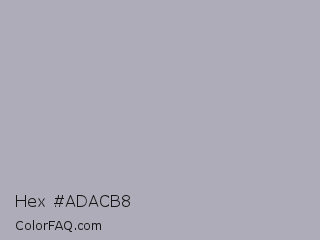 Hex #adacb8 Color is a light indigo color and the nearest color is Spun Pearl #aaabb7. Hex code #adacb8 and RGB value is rgb(173,172,184). In RGB color space, this color is composed of 68% red, 67% green, 72% blue, In CMYK color space, this color is composed of 6% cyan, 7% magenta, 0% yellow , 28% black , In HSL color space, this color has a hue angle of 245° , 8% saturation and 70% lightness.