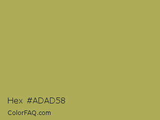 Hex #adad58 Color is a normal yellow color and the nearest color is Olive Green #b5b35c. Hex code #adad58 and RGB value is rgb(173,173,88). In RGB color space, this color is composed of 68% red, 68% green, 35% blue, In CMYK color space, this color is composed of 0% cyan, 0% magenta, 49% yellow , 32% black , In HSL color space, this color has a hue angle of 60° , 34% saturation and 51% lightness.