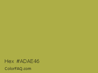 Hex #adae46 Color is a normal yellow color and the nearest color is Brass #b5a642. Hex code #adae46 and RGB value is rgb(173,174,70). In RGB color space, this color is composed of 68% red, 68% green, 27% blue, In CMYK color space, this color is composed of 1% cyan, 0% magenta, 60% yellow , 32% black , In HSL color space, this color has a hue angle of 61° , 43% saturation and 48% lightness.