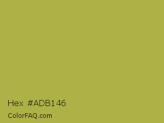 Hex #adb146 Color is a normal yellow color and the nearest color is Brass #b5a642. Hex code #adb146 and RGB value is rgb(173,177,70). In RGB color space, this color is composed of 68% red, 69% green, 27% blue, In CMYK color space, this color is composed of 2% cyan, 0% magenta, 60% yellow , 31% black , In HSL color space, this color has a hue angle of 62° , 43% saturation and 48% lightness.