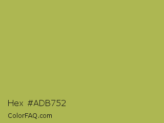 Hex #adb752 Color is a normal yellow color and the nearest color is Olive Green #b5b35c. Hex code #adb752 and RGB value is rgb(173,183,82). In RGB color space, this color is composed of 68% red, 72% green, 32% blue, In CMYK color space, this color is composed of 5% cyan, 0% magenta, 55% yellow , 28% black , In HSL color space, this color has a hue angle of 66° , 41% saturation and 52% lightness.