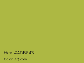 Hex #adb843 Color is a normal yellow color and the nearest color is Android Green #a4c639. Hex code #adb843 and RGB value is rgb(173,184,67). In RGB color space, this color is composed of 68% red, 72% green, 26% blue, In CMYK color space, this color is composed of 6% cyan, 0% magenta, 64% yellow , 28% black , In HSL color space, this color has a hue angle of 66° , 47% saturation and 49% lightness.