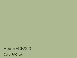 Hex #adb990 Color is a light lime color and the nearest color is Swamp Green #acb78e. Hex code #adb990 and RGB value is rgb(173,185,144). In RGB color space, this color is composed of 68% red, 73% green, 56% blue, In CMYK color space, this color is composed of 6% cyan, 0% magenta, 22% yellow , 27% black , In HSL color space, this color has a hue angle of 78° , 23% saturation and 65% lightness.