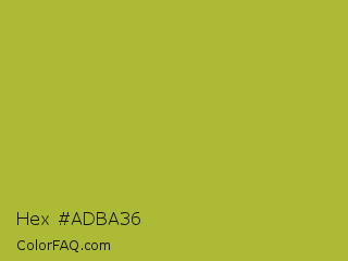 Hex #adba36 Color is a normal yellow color and the nearest color is Android Green #a4c639. Hex code #adba36 and RGB value is rgb(173,186,54). In RGB color space, this color is composed of 68% red, 73% green, 21% blue, In CMYK color space, this color is composed of 7% cyan, 0% magenta, 71% yellow , 27% black , In HSL color space, this color has a hue angle of 66° , 55% saturation and 47% lightness.