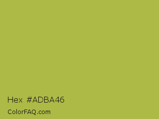 Hex #adba46 Color is a normal yellow color and the nearest color is Android Green #a4c639. Hex code #adba46 and RGB value is rgb(173,186,70). In RGB color space, this color is composed of 68% red, 73% green, 27% blue, In CMYK color space, this color is composed of 7% cyan, 0% magenta, 62% yellow , 27% black , In HSL color space, this color has a hue angle of 67° , 46% saturation and 50% lightness.