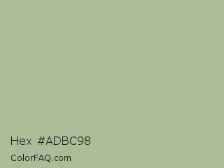 Hex #adbc98 Color is a light green color and the nearest color is Laurel Green #a9ba9d. Hex code #adbc98 and RGB value is rgb(173,188,152). In RGB color space, this color is composed of 68% red, 74% green, 60% blue, In CMYK color space, this color is composed of 8% cyan, 0% magenta, 19% yellow , 26% black , In HSL color space, this color has a hue angle of 85° , 21% saturation and 67% lightness.