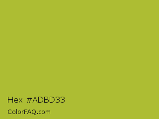 Hex #adbd33 Color is a normal yellow color and the nearest color is Android Green #a4c639. Hex code #adbd33 and RGB value is rgb(173,189,51). In RGB color space, this color is composed of 68% red, 74% green, 20% blue, In CMYK color space, this color is composed of 8% cyan, 0% magenta, 73% yellow , 26% black , In HSL color space, this color has a hue angle of 67° , 58% saturation and 47% lightness.