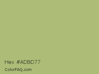 Hex #adbd77 Color is a normal lime color and the nearest color is Misty Moss #bbb477. Hex code #adbd77 and RGB value is rgb(173,189,119). In RGB color space, this color is composed of 68% red, 74% green, 47% blue, In CMYK color space, this color is composed of 8% cyan, 0% magenta, 37% yellow , 26% black , In HSL color space, this color has a hue angle of 74° , 35% saturation and 60% lightness.