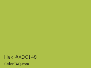 Hex #adc148 Color is a normal yellow color and the nearest color is Android Green #a4c639. Hex code #adc148 and RGB value is rgb(173,193,72). In RGB color space, this color is composed of 68% red, 76% green, 28% blue, In CMYK color space, this color is composed of 10% cyan, 0% magenta, 63% yellow , 24% black , In HSL color space, this color has a hue angle of 70° , 49% saturation and 52% lightness.