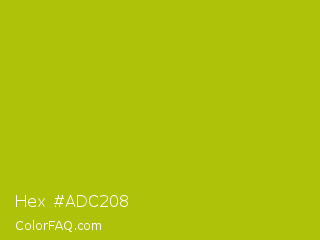Hex #adc208 Color is a normal yellow color and the nearest color is La Rioja #b3c110. Hex code #adc208 and RGB value is rgb(173,194,8). In RGB color space, this color is composed of 68% red, 76% green, 3% blue, In CMYK color space, this color is composed of 11% cyan, 0% magenta, 96% yellow , 24% black , In HSL color space, this color has a hue angle of 67° , 92% saturation and 40% lightness.