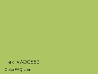 Hex #adc563 Color is a normal lime color and the nearest color is Middle Green Yellow #acbf60. Hex code #adc563 and RGB value is rgb(173,197,99). In RGB color space, this color is composed of 68% red, 77% green, 39% blue, In CMYK color space, this color is composed of 12% cyan, 0% magenta, 50% yellow , 23% black , In HSL color space, this color has a hue angle of 75° , 46% saturation and 58% lightness.