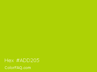Hex #add205 Color is a normal lime color and the nearest color is Vivid Lime Green #a6d608. Hex code #add205 and RGB value is rgb(173,210,5). In RGB color space, this color is composed of 68% red, 82% green, 2% blue, In CMYK color space, this color is composed of 18% cyan, 0% magenta, 98% yellow , 18% black , In HSL color space, this color has a hue angle of 71° , 95% saturation and 42% lightness.