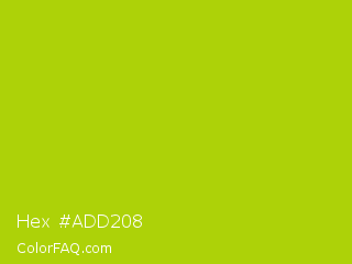Hex #add208 Color is a normal lime color and the nearest color is Vivid Lime Green #a6d608. Hex code #add208 and RGB value is rgb(173,210,8). In RGB color space, this color is composed of 68% red, 82% green, 3% blue, In CMYK color space, this color is composed of 18% cyan, 0% magenta, 96% yellow , 18% black , In HSL color space, this color has a hue angle of 71° , 93% saturation and 43% lightness.