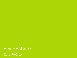 Hex #add607 Color is a normal lime color and the nearest color is Vivid Lime Green #a6d608. Hex code #add607 and RGB value is rgb(173,214,7). In RGB color space, this color is composed of 68% red, 84% green, 3% blue, In CMYK color space, this color is composed of 19% cyan, 0% magenta, 97% yellow , 16% black , In HSL color space, this color has a hue angle of 72° , 94% saturation and 43% lightness.