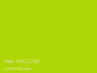 Hex #add706 Color is a normal lime color and the nearest color is Vivid Lime Green #a6d608. Hex code #add706 and RGB value is rgb(173,215,6). In RGB color space, this color is composed of 68% red, 84% green, 2% blue, In CMYK color space, this color is composed of 20% cyan, 0% magenta, 97% yellow , 16% black , In HSL color space, this color has a hue angle of 72° , 95% saturation and 43% lightness.